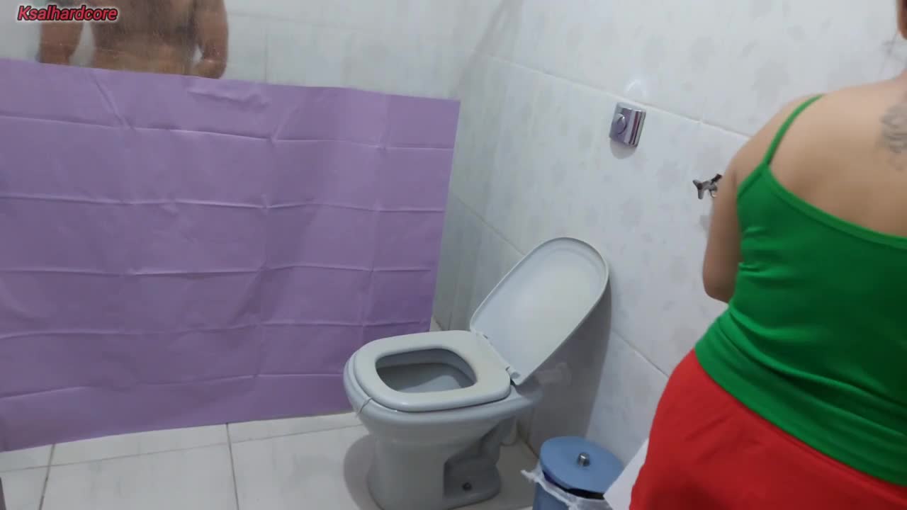 Stepmom gets a surprise while taking a shower in the bathroom