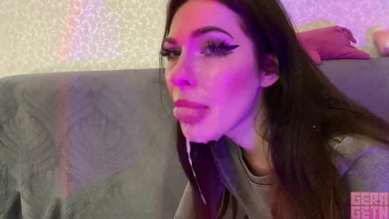 cute brunette sucking dick in homemade blowjob with deepthroat and cum in mouth..